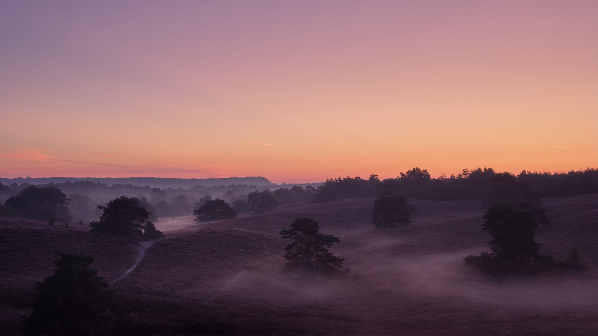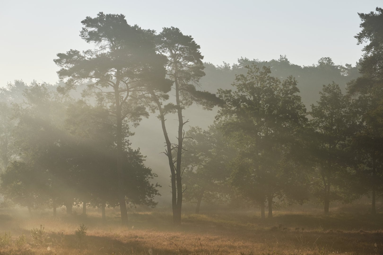 Early morning mist drifts through the trees in National Park Hoge Kempen (Limburg, Belgium). Because it was at the end of September, the heath was still quite purple which gives the scene a nice color-contrast as well! (2017)